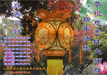 法轮大法好!真善忍好! 感谢师尊的慈悲救度,您的圣恩永远难忘,道不尽思念,愿您早日回到家乡。 在新的一年里,弟子要努力做好三件事,圆满随师还。谢谢师父! 山西省晋中市榆次区教育系统一大法弟子恭祝慈悲伟大的师尊新年快乐!