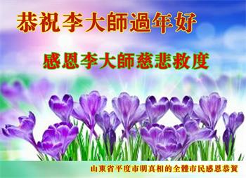 恭祝师父新年快乐!正法洪传。 保定市高碑店市一明真相的大法弟子家属敬上 山东省青岛市平度市明真相市民恭祝李大师过年好!