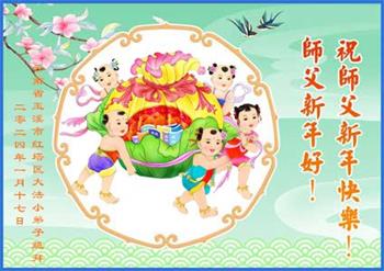 敬爱的师父:您好!我是您的一名8岁的大法小弟子。谢谢您帮我承受了业力的痛苦。祝您龙年大吉,天天快乐! 广东省梅州市一大法小弟子恭祝师尊过年好!