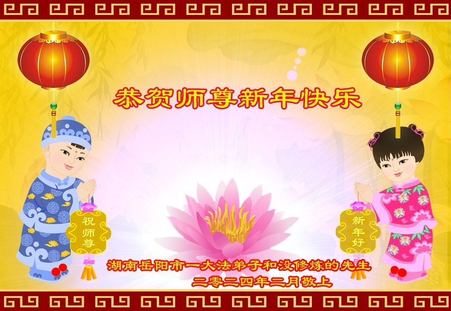 尊敬的师尊好,您辛苦了!新年伊始,弟子们给师尊拜年了,感恩师尊的慈悲苦度! 我是九六年得法的大法学员,之前身体、精神状态都很不好:百病缠身、愤世嫉俗、精神萎靡,多次都想出家,多次想轻生,只因父母还在,儿子太小,更是冥冥中恩师的保护才没有丧失人身,才有机会得到这千载难逢的高德大法,才能修炼返本归真! 是恩师把我们从地狱中捞起洗净;是恩师为我们承受了巨大业力和业债;是恩师把我们推上了一个又一个的修炼台阶,离天国世界的家越来越近。弟子们对恩师的感恩无法言表!唯有精進!精進!更精進!回报师恩! 我俩三叩首,再一次叩拜恩师 二零二四年一月二十四日 湖南省益阳市安化县一大法弟子恭祝慈悲伟大的师尊过年好!