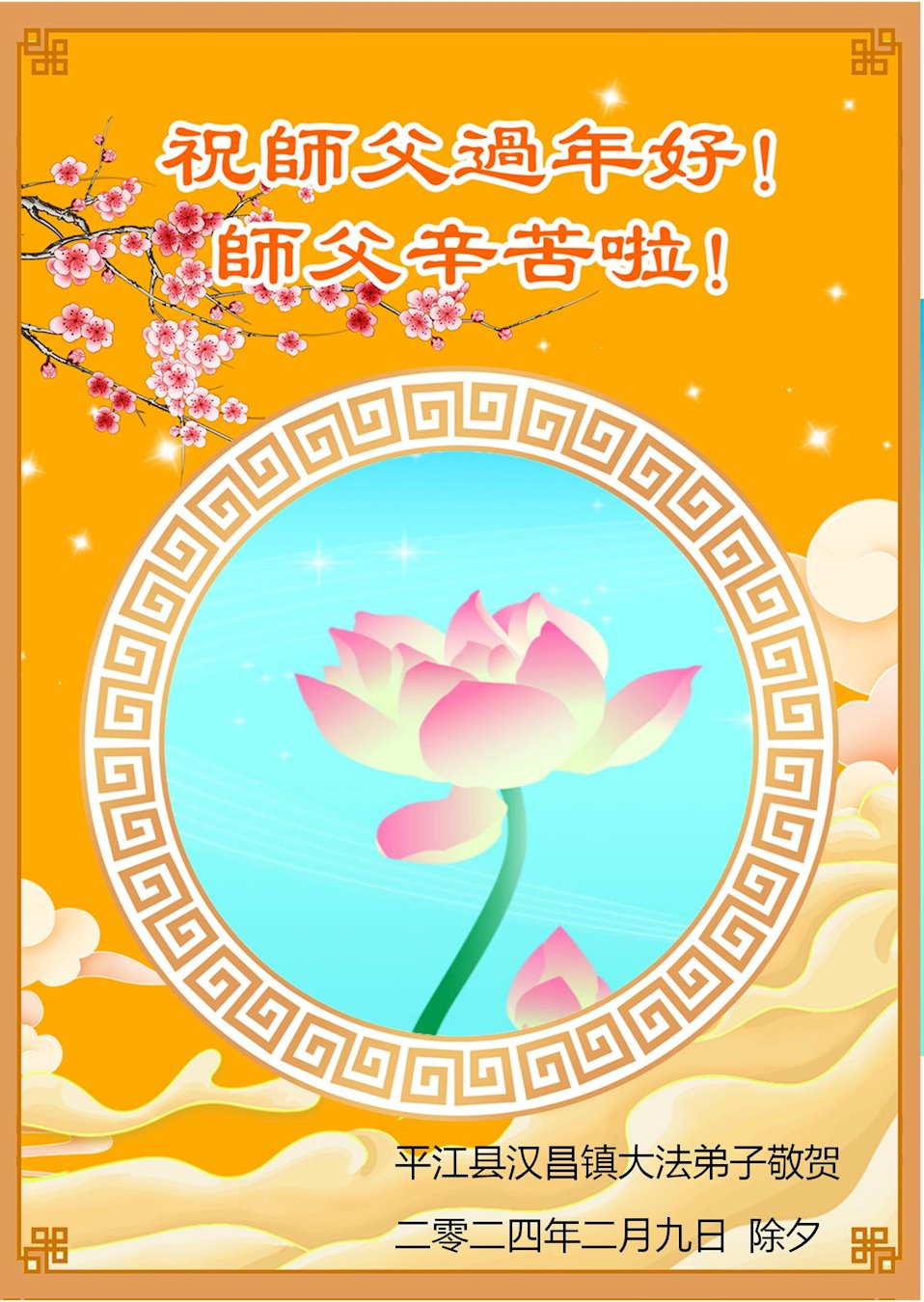 平江县汉昌镇大法弟子敬上 二零二四年二月九日 除夕 湖南省岳阳市湘阴县全体大法弟子恭祝师尊新年快乐!