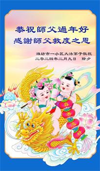 师父过年好!师父辛苦了! 感恩师尊慈悲救度!弟子们唯有精進实修,做好三件事,助师救度众生,以报师恩。 叩拜师尊! 山东潍坊大法弟子一家人敬上 二零二四年二月九日 除夕 山东省潍坊市峡山区全体大法弟子恭祝慈悲的师尊过年好!