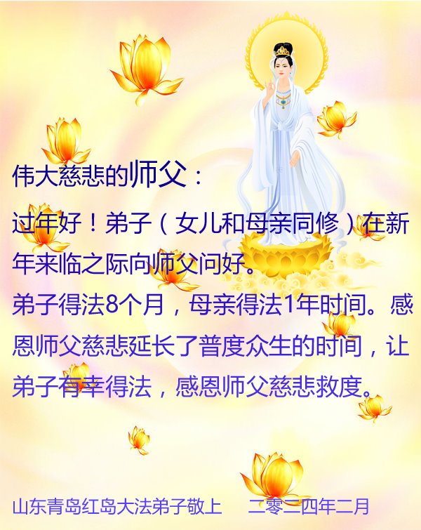 弟子(女儿和母亲)在新年来临之际向师父问好! 弟子得法8个月,母亲得法1年时间。感恩师父慈悲延长了普度众生的时间,让弟子有幸得法,感恩师父慈悲救度。 山东青岛红岛大法弟子敬上 山东省青岛市大法弟子恭祝师尊过年好!