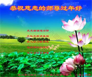 感恩师尊救度之恩!师尊辛苦了! 在新的一年里,弟子要不断精進,让师尊少一些操劳,多一些欣慰! 湖北省枣阳市一大法弟子敬上 北京市海淀区一大法弟子和武汉市武昌区南湖一学法小组大法弟子恭祝师尊过年好!