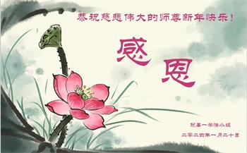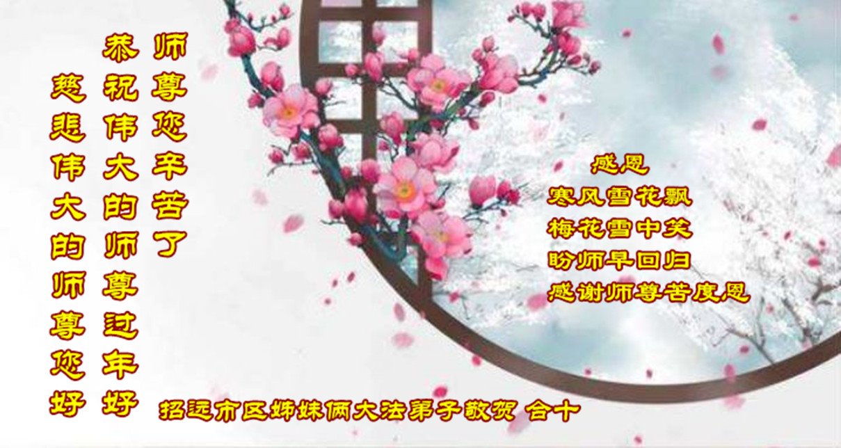 感恩师尊慈悲救度! 弟子们叩谢师尊! 弟子们要努力做好三件事,圆满跟师尊回家。 烟台龙口市一全家大法弟子敬上 山东省聊城市冠县一大法弟子恭祝慈悲伟大的师尊过年好!