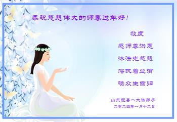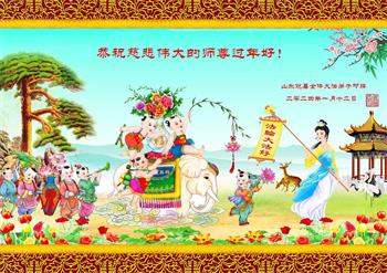 感恩师尊慈悲救度之恩。 弟子们要整体配合好,多救众生。 山东省聊城市冠县一学法小组大法弟子恭祝慈悲伟大的师尊新年快乐!
