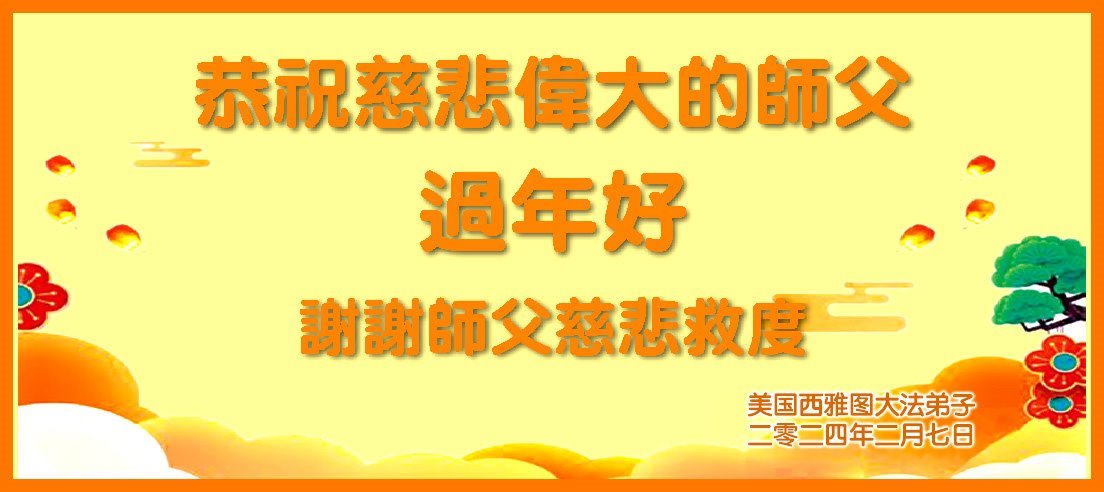 【明慧网二零二四年二月十二日】甲辰年新年之际,美国西雅图、旧金山、洛杉矶、圣地亚哥、圣荷西、波特兰、硅谷、科罗拉多州、拉斯维加斯大法弟子恭祝师尊过年好! 美国华盛顿州西雅图大法弟子恭祝师尊过年好!