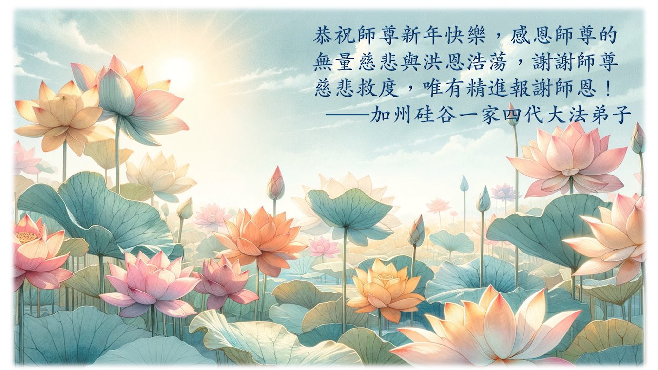 感恩慈悲伟大的师尊对媒体的关心和看护,我们会更加努力,在助师正法的修炼路上修好自己,救度更多的众生。 旧金山大.纪.元;新!唐!人:全体大法弟子敬上 二零二四年二月九日 美国加州硅谷一家四代大法弟子恭祝师尊新年快乐!