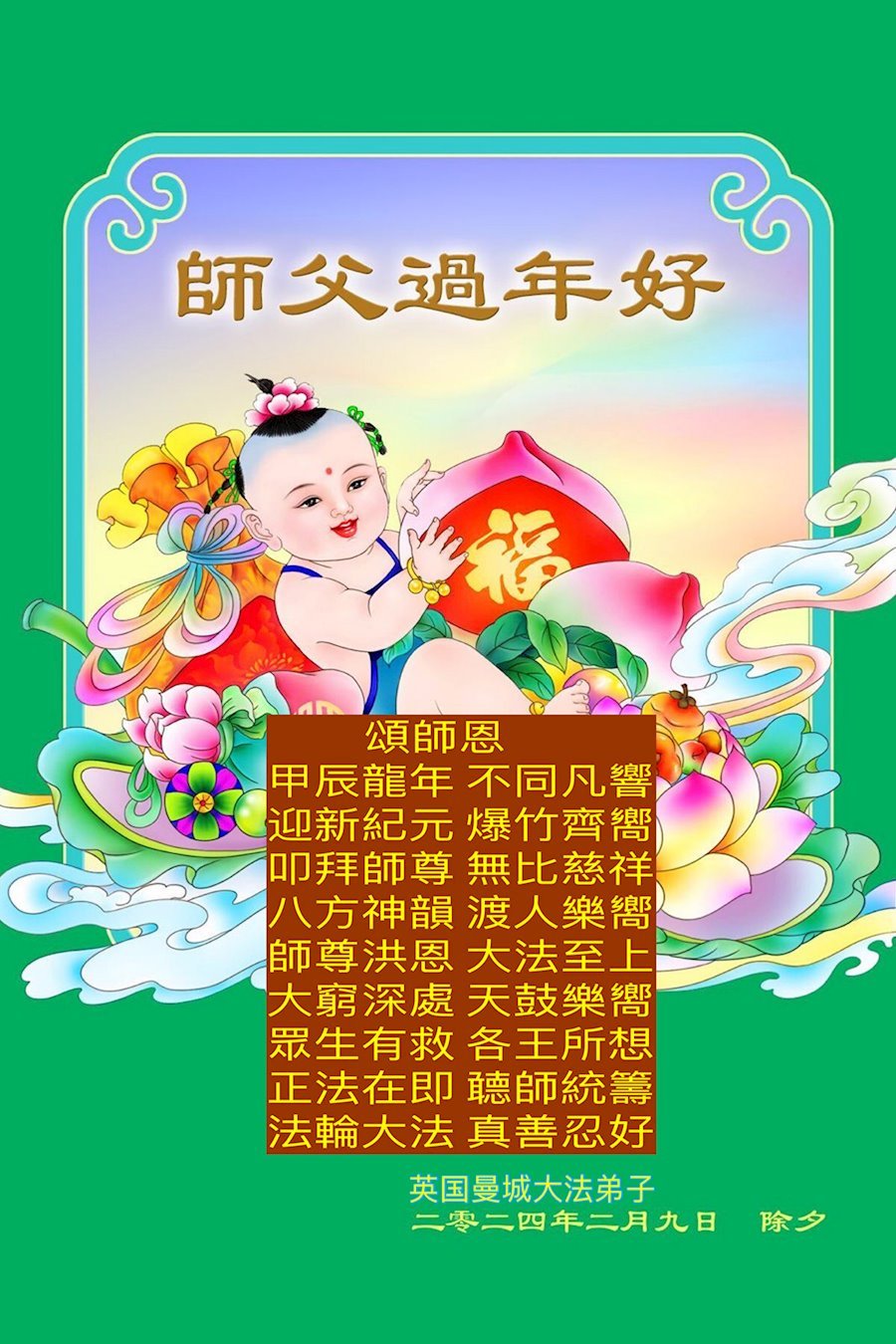 感恩师尊将万古难遇的大法传给世人,感恩师尊对弟子的保护和鼓励,弟子们在新的环境中,会尽快去除党文化的毒害,修好自己,跟同修配合好,多救世人,跟师尊回家。 东北在荷兰母女三人敬上 二零二四年二月九日 除夕 伦敦一大法弟子恭祝师父新年快乐!