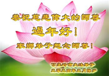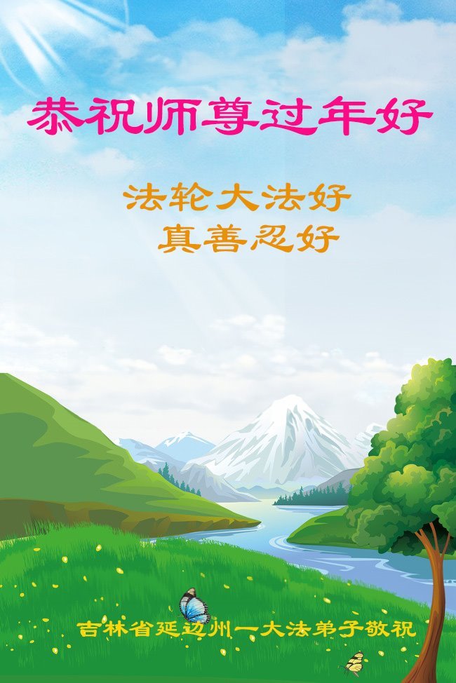 师尊您好!弟子在这里给您拜年!祝师尊过年好!弟子一定精進、再精進!做好三件事,修好自己,跟师父回家。 伊通县两位大法弟子敬上 吉林省通化市一大法弟子恭祝师父过年好!