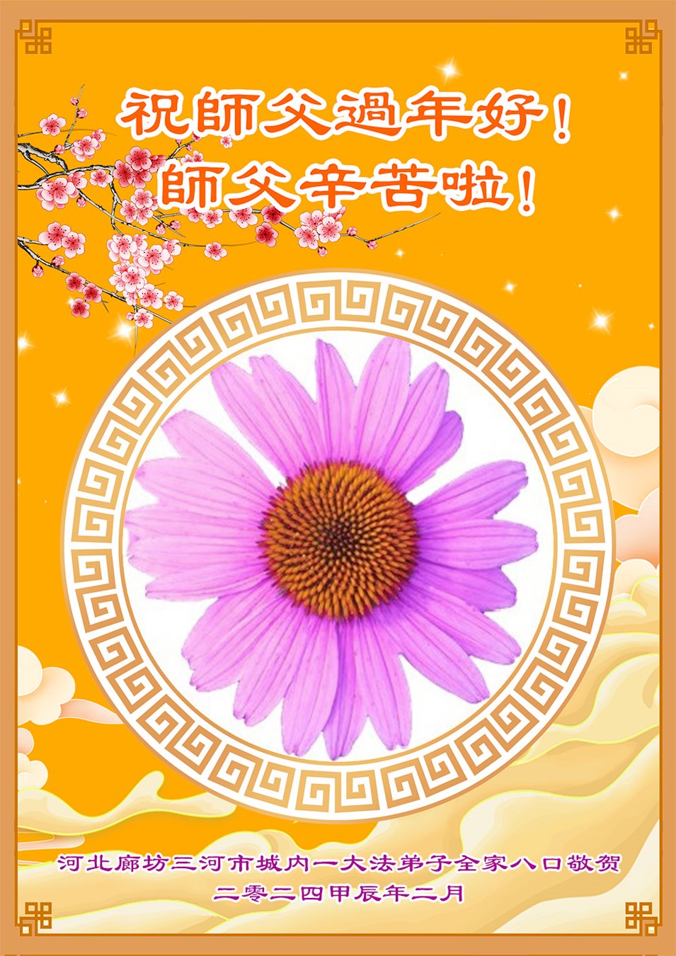 河北廊坊三河市城内一大法弟子全家八口恭祝师父过年好!