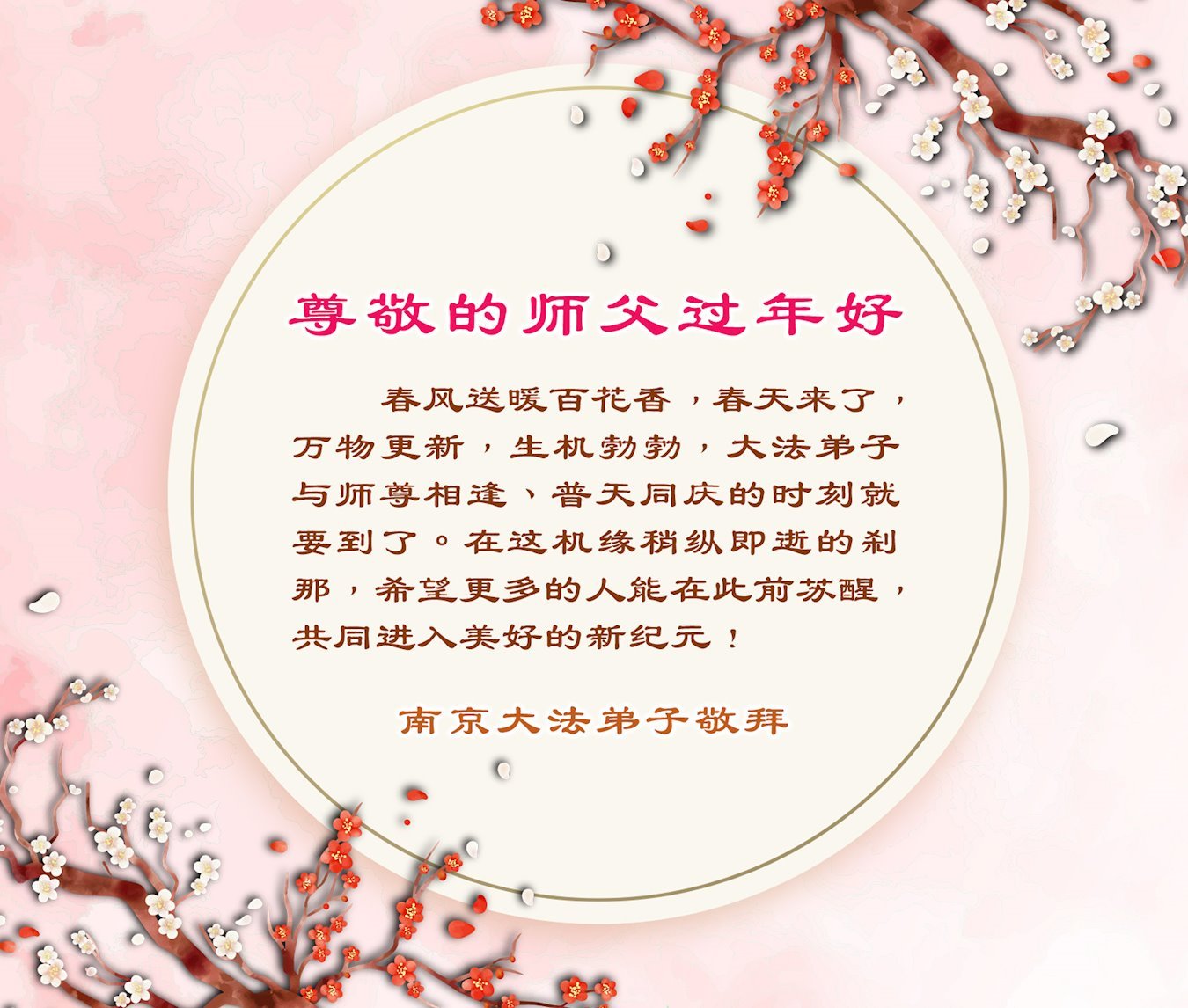 尊敬的师父过年好! 春风送暖百花香,春天来了,万物更新,生机勃勃,大法弟子与师尊相逢、普天同庆的时刻就要到了。在这机缘稍纵即逝的刹那,希望更多的人能在此前苏醒,共同進入美好的新纪元! 南京一大法弟子敬上 2024年2月8日 江苏省无锡地区大法弟子恭祝师尊新年好!