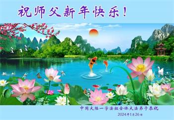 感恩师尊慈悲救度!师尊辛苦了! 又是一年新年到,弟子要继续再精進,不辱使命,不负众望,让师父放心。 中国大陆一大法弟子及明白真相家人敬上 二零二四年一月三十日 中国大陆一学法组全体大法弟子恭祝慈悲伟大的师父新年快乐!
