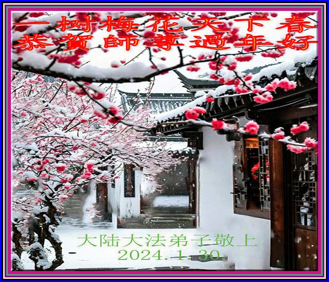 新年新气象, 万物沐春风。 傲雪清梅朵, 凌寒有劲松。 共修真善忍, 同颂法轮功。 向上欣欣意, 新生在法中。 中国大陆一大法弟子叩拜 二零二四零年一月二十九日 中国大陆一学法小组三名大法弟子恭祝师父过年好!