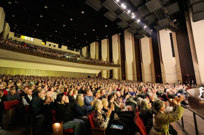 身为音乐人,马里奥·戈多伊曾前往二十多个国家演出。他说:“神韵的音乐非常好,一开始我以为是录音的,但很快意识到这不是录音,而是真正的(现场)音乐, 太好了!所有的一切在时间上的配合效果都恰到好处,所有的音乐都棒极了,西洋乐器如小提琴、中提琴等,还有其它所有的乐器,我都很喜欢!我一直都听得入神。” “我可以感觉到这种伟大的结合,非常平衡的感觉,乐团使用来自东方文化中特有的历史悠长的乐器,是如此完美,这些声音太棒了,太甜美了!” 他认为神韵作曲家的水平极为高超,“作曲非常棒,舞蹈动作和故事与作曲非常契合。 无论是舞蹈表现紧张的情节,或令人愉快的场景,或其它的情感和动作,音乐就在完美的配合,就象看电影一样。这些作曲都非常好,非常完美。音乐很完美,绝对完美。我不知道,神韵是只有一位作家或许多作曲家,但我很喜欢,作品都很完美。整场演出的配乐非常完美。” “钢琴家很棒,有很多(优点),很难说是哪一个点,而这正是妙处所在。 她知道如何以正确的音量演奏音乐。 这是完美的,让观众感觉很棒。我很喜欢这个节目。”他继续赞叹:“还有指挥,她是一个伟大的指挥家,完美,十分完美!” 马里奥·戈多伊对二胡独奏也非常推崇,“我很喜欢二胡,它只有两根弦,我认为这不仅仅是技术,而是演奏者的情感展现,而这就是音乐,是艺术家透过音乐所在说话。二胡独奏让我觉得身处另一个星球,或者在古代的中国。因为透过音乐,你可以感受到这一点!” 他并说:“我很享受今天的演出,很高兴带我的家人来看了神韵。” 亚利桑那州成人教育学院主任感谢神韵“照耀整个世界” .纪.元;)'> 图9:龙年初一和初二(二月十日和十一日),神韵北美艺术团在亚利桑那州图森音乐厅(Linda Ronstadt Music Hall)上演了三场演出,票房均爆满。图为年初二晚演出时,观众报以热烈掌声向演员致谢。(大.纪.元;) |