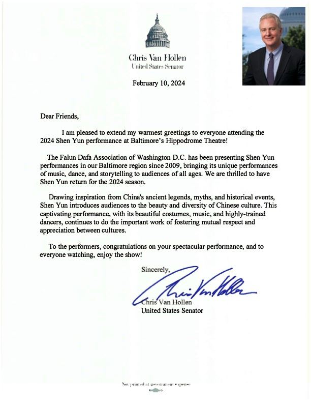 二月十日和十一日,美国神韵艺术团将再次莅临美国马里兰州巴尔的摩市的竞技场剧院连演三场。演出前多名政要发褒奖和贺信,欢迎神韵。 .纪.元;)'> 图14:美国马里兰州联邦参议员克里斯·凡-浩伦(Chris Van Hollen)特别致信神韵演出主办方-华盛顿DC法轮大法学会,欢迎神韵艺术团再次莅临巴尔的摩。(大.纪.元;) |