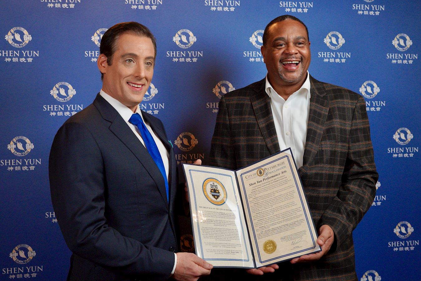 宾州州长夏皮罗(Josh Shapiro)在给神韵艺术团的贺信中写道:“感谢神韵艺术团通过艺术才华增强了我们社区的文化、教育和经济活力。我希望这些演出能够激励所有观众。” .纪.元;)'> 图12:二零二四年一月二十七日下午,匹兹堡市市长艾德·盖尼(Ed Gainey,右一)到本尼德表演艺术中心向神韵艺术团颁发褒奖。(大.纪.元;) |