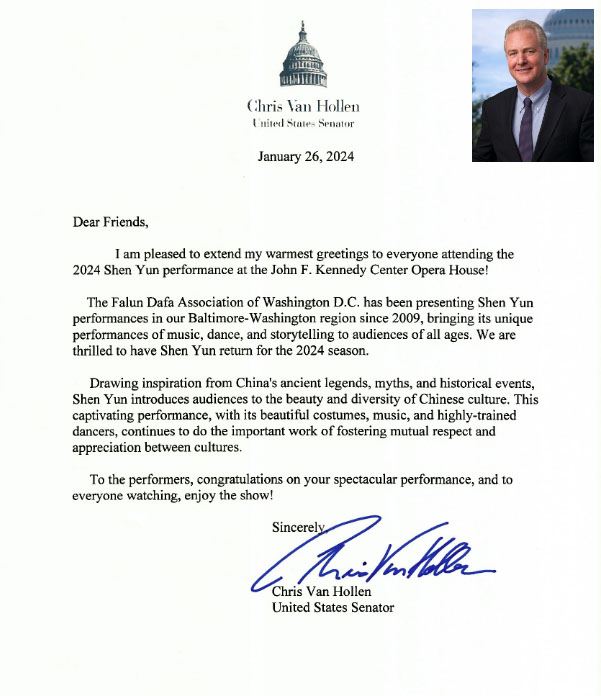 二零二四年一月二十七日,神韵北美艺术团莅临美国克利夫兰市。神韵艺术团的到来收到了当地政要的欢迎,俄亥俄州州长迈克·德温(Mike DeWine)发来贺信;代表俄亥俄州135区国会议员,俄亥俄22区州议员胡安妮塔·奥·布伦特(Juanita O·Brent)也颁发了褒奖。另外还有六个城市的市长也颁发的褒奖令。 俄亥俄州州长迈克·德温(Mike DeWine)在贺信中说:“我们非常荣幸有机会能通过神韵艺术团在辛辛那提市(Cincinnati)、代顿市(Dayton)、哥伦布(Columbus)和克利夫兰市(Cleveland)的演出,体验中国文化。” .纪.元;)'> 图14:美国马里兰州联邦参议员克里斯·凡-浩伦(Chris Van Hollen)致贺信迎接神韵的莅临。(大.纪.元;) |