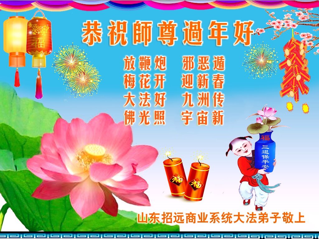 放鞭炮 邪恶遁 梅花开 迎新春 大法好 九州传 佛光照 宇宙新 招远市一商业系统大法弟子敬上 中国大陆科研系统大法弟子恭祝师尊过年好!