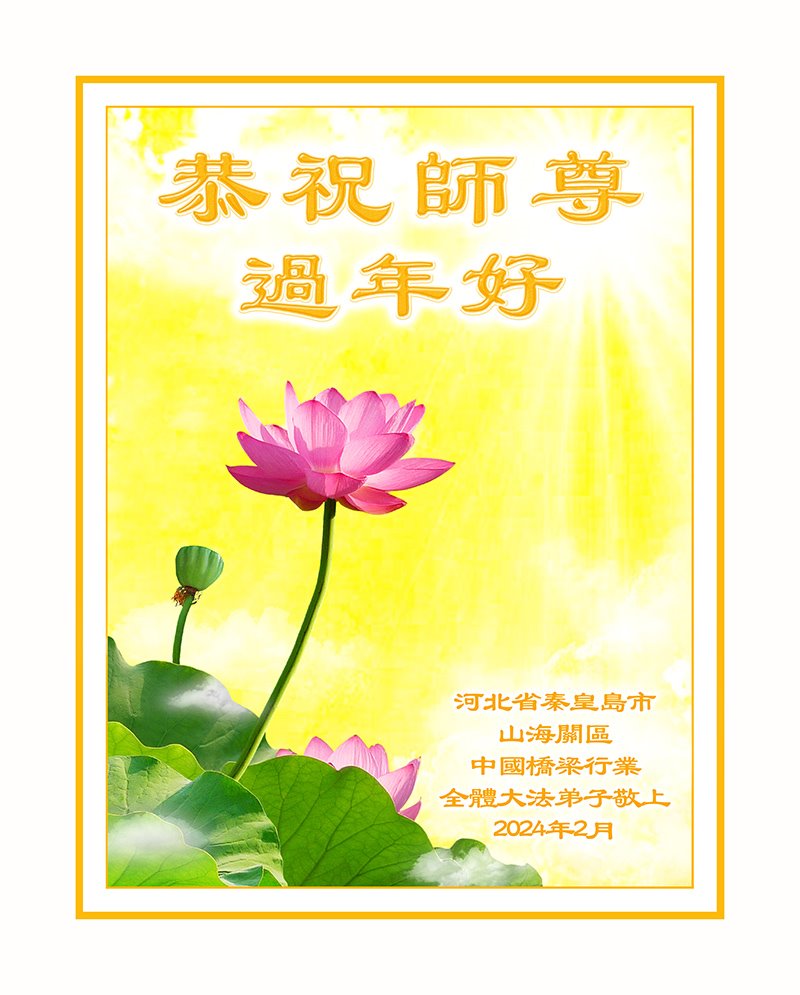 中国传统的新春佳节即将到来,来自中国各地、各行各业的大法弟子们想念远在大洋彼岸的慈悲伟大的李洪志师父,叩拜师尊过年好!大法弟子们表示,一定要时时用师父的法衡量自己,不断的同化大法,修成新宇宙的正觉。 下面是部份来自文艺界、音乐界、医疗、教育、律师行业、军工、外交、航空航天、IT行业、税务、科研、卫生、财务、审计、桥梁、船舶、自动化仪表、餐饮、水利、交通、金融、重机、林业局、银行、建筑、食品、煤炭、市场监督、电力、服务、油田、检察、统计、外贸、钢铁、纺织、供销、银保监、商业、地矿、黄金、农垦、石化、环境艺术、燃气、邮政、拍卖师、自然资源、粮食、环卫等50余行业的大法弟子敬致师尊的新年问候。 河北省秦皇岛市山海关区中国船舶行业全体大法弟子恭祝慈悲伟大的师尊过年好!