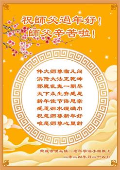 感恩师父的慈悲救度,在修炼中有过迷茫,有过喜悦,更多的是剜心透骨去执着心的过程,在师父的慈悲加持下走了过来。在新的一年里,我一定更加做好三件事,修去自我,不负师父的救度之恩!谢谢师父! 山东省聊城市茌平区大法弟子敬上 二零二四年一月二十四日 山东省聊城市茌平区一学法小组全体大法弟子敬贺师父过年好!