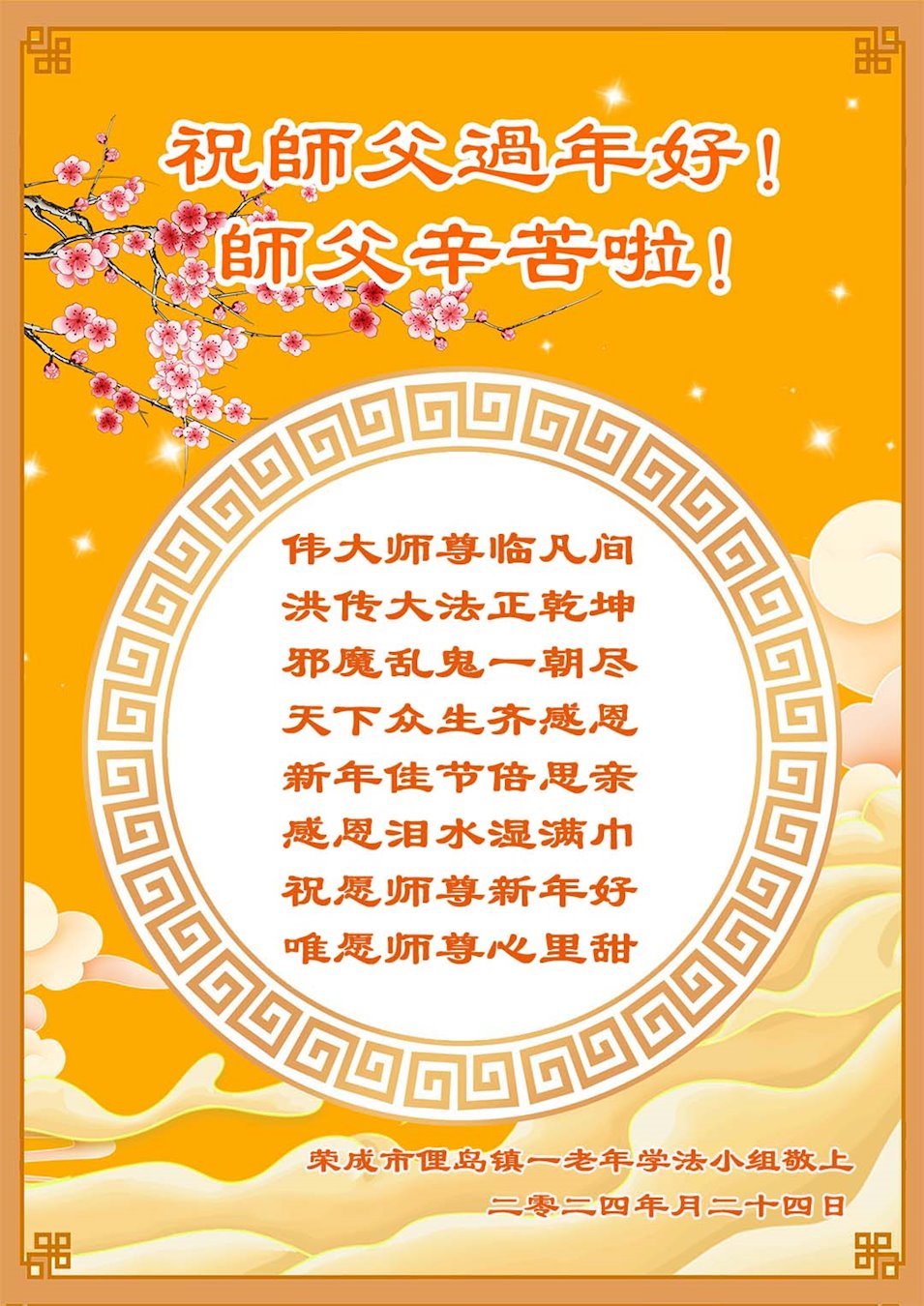 伟大的师父您辛苦了!祝师父过年好! 山东烟台开发区一家大法弟子敬上 二零二四年一月二十四日 山东省威海市荣成市俚岛镇一老年学法小组大法弟子恭贺伟大师尊过年好!