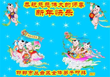 师父您好!感谢师尊的洪大佛恩!您为弟子们付出了一切,您辛苦了,感恩师尊的慈悲救度与保护,请师尊放心,我们在新的一年里一定要形成整体,紧跟师尊正法進程,学好法,向内找,真修实修,多救人,完成使命,兑现誓约,不负师尊慈悲苦度,走出人走向神,再次成为伟大的神! 河北邯郸大法弟子夫妻敬上 2024年1月23日。 河北省邯郸市丛台区全体大法弟子恭祝慈悲伟大的师尊新年快乐!