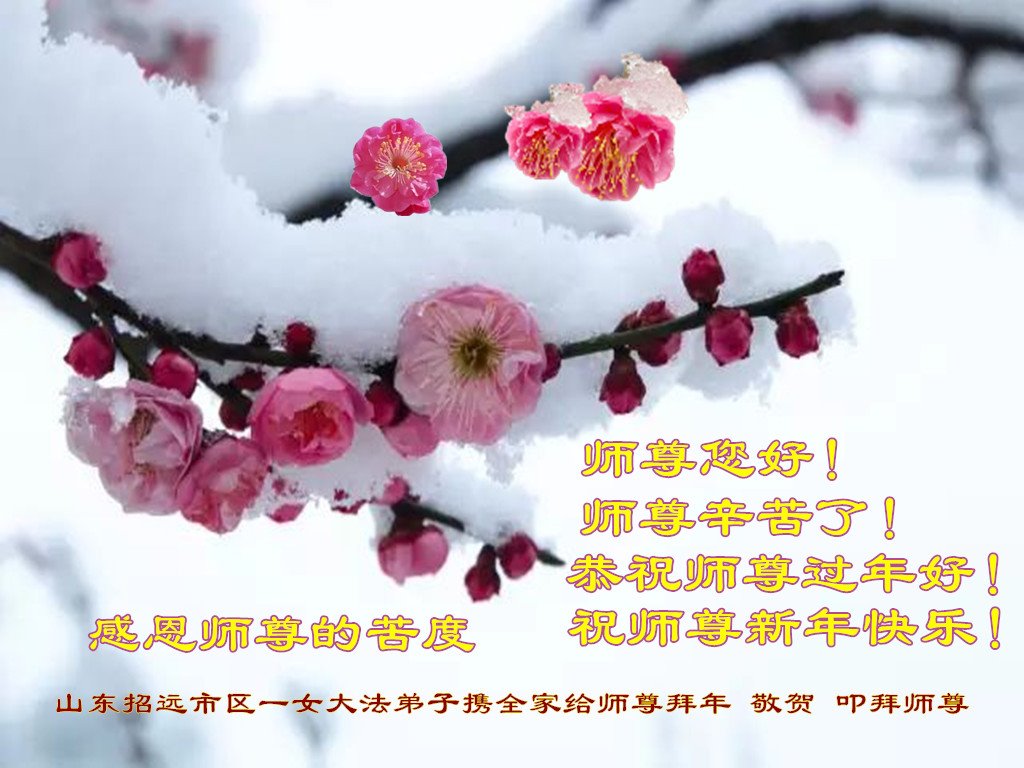 山东省烟台市招远市区一女大法弟子携全家恭祝师尊过年好!