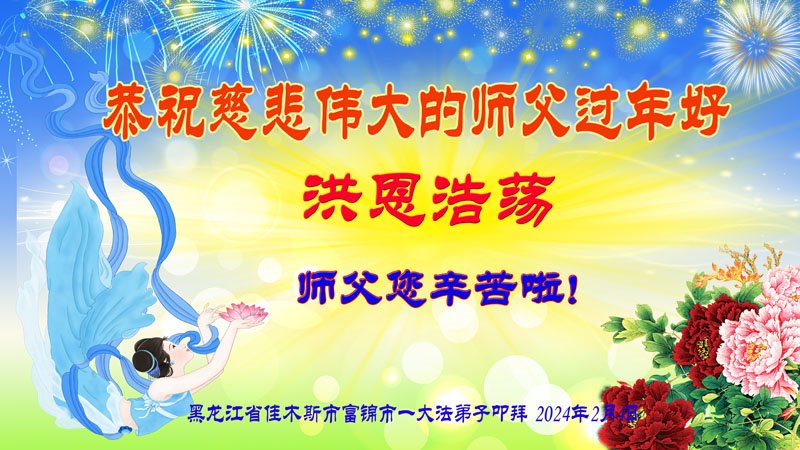 感恩师父慈悲苦度!弟子只有精進再精進,学好法,修好自己多救人,做好三件事,跟师父回家,报答师父救度之恩。 黑龙江省佳木斯市富锦市一大法弟子恭祝师父过年好!