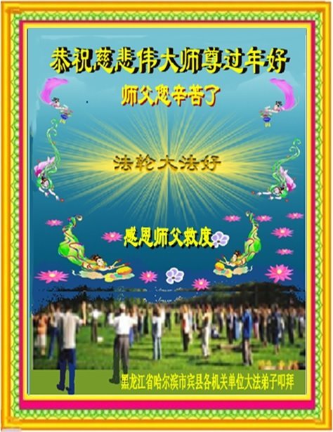 在新的一年里弟子要更加精進,一定做好三件事,学好法、修去执着,跟师父回家。 黑龙江省宾县政府各机关单位大法弟子恭贺慈悲伟大师父过年好!