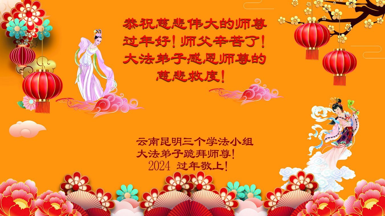 值此夏历甲辰年来临之际,我们重庆市沙坪坝区学法小组和沙坪坝区十人学法小组的弟子们怀着最真挚的感恩师尊的心,恭祝师尊新年快乐!师尊过年好!师尊您辛苦了! 沐浴着师尊的浩荡佛恩,弟子们在再次成为神的路上,已经走了近30年。这些年,无论是在坚持集体学法的学法小组,还是每天单独在家学法的小屋里;无论是在居民楼里、在学生们上下学、大人们上下班的路上、办公室里、工地上、老人们娱乐休闲的各种场所,弟子们发放真相资料或面对面讲清真相劝三:退.的时候;无论是在邪恶的黑窝里遭受痛苦折磨时,还是剜心透骨去人的执着痛彻心扉时,弟子们在修炼路上所做的、所经历的每一件事,都浸透着师尊的慈悲看护和谆谆教诲。 弟子们深知,为了我们的修炼,我们生命的更新,再造圣者,师尊替我们遭了无数的罪。这巨大的慈悲,神圣的恩典,弟子们铭记在心。师父的圣恩,弟子们无以为报,唯有遵照师父的教诲,不辜负师父的殷切期望,学好法,修好自己,广传真相,多救人,把可救的生命带上回归之路,兑现神圣而伟大的责任,再次成为神,圆满随师还。 云南省昆明市三个学法小组全体大法弟子恭祝慈悲伟大的师尊过年好!