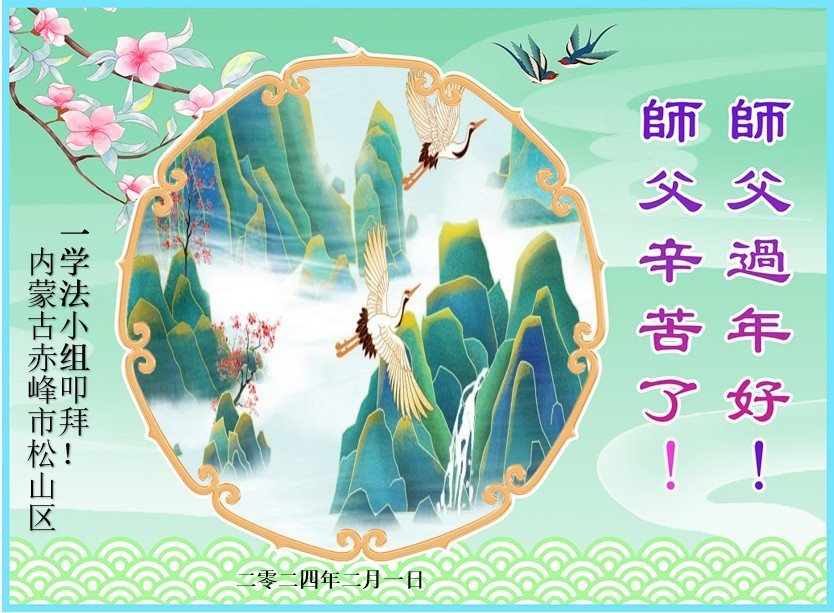 师尊辛苦了!弟子是新学员,今年八十二岁。是师尊救了我的命,弟子沐浴在师尊的佛光里,温暖、幸福。弟子要跟师尊回家。 内蒙古自治区赤峰市松山区一学法小组大法弟子恭祝师尊过年好!