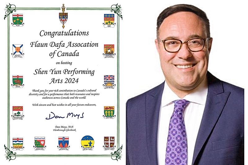 “真是一次令人惊羡的体验!这场演出综合了所有元素,非常赏心悦目。作为跳板跳水和跳台跳水教练,我当然了解这场演出背后、从技术到所有一切,每个人的付出。” 霍尔姆斯非常清楚:“舞蹈演员不仅要控制好落地时的技术动作,还要处理落地对身体的反作用力。在控制好旋转等动作的同时,还要用身体吸收来自地板的反作用力。这需要极高的技巧,而神韵舞蹈家完成得极为轻巧,真是赏心悦目。” 通过观看神韵,她也更坚定了自己的信仰:“看演出时我理解了根本上神是谁,神如何造了人,人应该怎样追随神前行。两小时的演出将这个抽象主体具像化,非常感人,动人心魄。”她感悟到:“(神韵)表现了人性以及创世主期待我们彼此爱护、敬拜神明。” 她想告诉更多人:“这场演出太奇妙了,观众就像在祈祷,演出展现了创世主创造我们人类的目的,综合多种艺术表现得如此美妙,从艺术中我们所能期待的一切,在神韵(演出中)都能看到。” .纪.元;)'> 图12:汉密尔顿选区国会议员丹·穆伊斯(Dan Muys)为2024年度神韵巡回演出发来贺信。(大.纪.元;) |