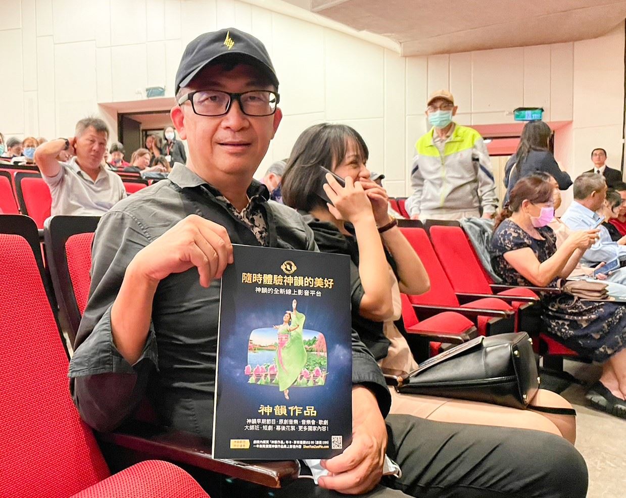 “我最感动的就是最后的那个节目《大圆满》,她展现的是包容,也让大家能够得到启发。最终她可以使人向善,展现邪不胜正终究是真理。”台南市安南狮子会会长卢昕宏赞誉道。 卢昕宏赞叹神韵演出充满“希望和光明”、“在我们台湾、乃至全世界,都没有(任何团体)能够超越的一个演出。”他称赞“每一个舞剧都对我们人的身心灵有启发”,“像舞剧《寒窑》,我们都知道(王宝钏)苦守寒窑十八载,那当然就是呈现一个信念、一个坚持。”“我想这也是神韵追求的一个部份。”他认为这也象征神韵的精神。 高雄艺术特区总监:看到了亿万人的希望 .纪.元;)'> 图6:四月十日晚间,高雄驳二艺术特区艺术总监陈建大明观赏神韵纽约艺术团在台南文化中心的第二场演出。(大.纪.元;) |