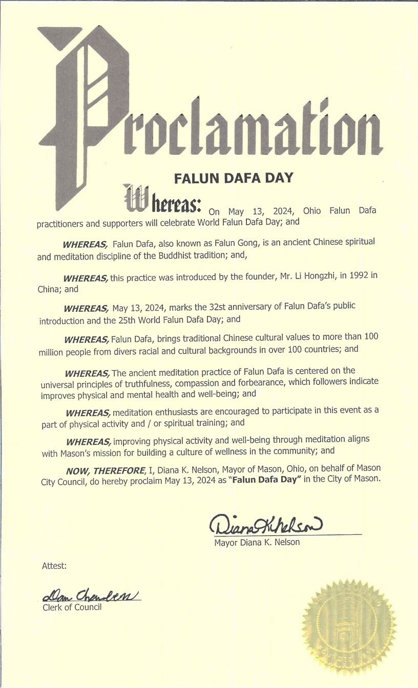 | 【明慧网二零二四年四月三十日】在世界法轮大法日到来之前,美国俄亥俄州梅森市市长褒奖法轮大法,宣布二零二四年五月十三日为梅森市的“法轮大法日”。图:俄亥俄州梅森市法轮大法日颁奖书 下面是颁奖书全文: 鉴于,二零二四年五月十三日,俄亥俄州法轮大法修炼者和支持者将庆祝世界法轮大法日; 鉴于,法轮大法又称法轮功,是基于佛家传统的中国修炼功法; 鉴于,二零二四年五月十三日,是法轮大法弘传世界三十二周年和第二十五个法轮大法日; 鉴于,法轮大法把中国传统价值带给全球超过一百个国家的一亿不同种族和文化背景的人; 鉴于,法轮大法这种传统的修炼方法,是以真、善、忍为中心,修炼人表示会提升身体和精神健康,积聚福祉; 鉴于,鼓励冥想爱好者参加这个活动作为提升身体和精神健康的训练; 鉴于,梅森市建立健康社区的使命,通过冥想提升人们健康和福祉; 现在,因此,我,戴安娜·K·纳尔逊,俄亥俄州梅森市市长,代表梅森市政府,在此宣布二零二四年五月十三日为梅森市的“法轮大法日”。