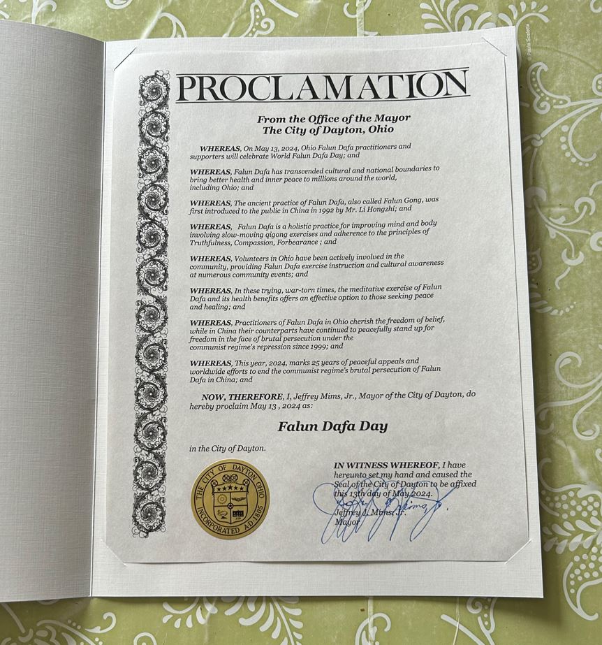 | 【明慧网二零二四年四月三十日】在世界法轮大法日到来之前,美国俄亥俄州代顿市市长褒奖法轮大法,宣布二零二四年五月十三日为代顿市的“法轮大法日”。图:俄亥俄州代顿市法轮大法日颁奖书 下面是颁奖书全文: 鉴于,二零二四年五月十三日,俄亥俄州法轮大法修炼者和支持者将庆祝世界法轮大法日。 鉴于,法轮大法超越了文化和国界,为包括俄亥俄州在内的全世界数百万人带来了更好的健康身体和内心的平静;以及, 鉴于,法轮大法是古老功法,又称法轮功,于一九九二年由李洪志先生在中国首次向公众介绍;以及, 鉴于,法轮大法是一种提高身心的整体修炼,包括静功练习和坚持真、善、忍的原则;和, 鉴于,俄亥俄州的志愿者积极参与社区活动,在众多社区活动中提供法轮功功法指导和文化传播;以及, 鉴于,在这个艰难、饱受战争蹂躏的时代,法轮大法的打坐修炼及其有益健康的功法为寻求平和与康复的人提供了选择;以及, 鉴于,俄亥俄州的法轮大法修炼者珍视信仰自由,而中国的法轮大法修炼者自 一九九九年以来,面对共产主义政权的残酷迫害,还在继续和平地捍卫自由;以及, 鉴于,今年,即二零二四年,法轮大法和平上访二十五周年纪念日,全球范围竭力终止共产政权对在中国法轮大法残酷迫害, 因此,我,小杰弗里·J·米姆斯,俄亥俄州代顿市市长,在此宣布二零二四年五月十三日为代顿市的“法轮大法日”。