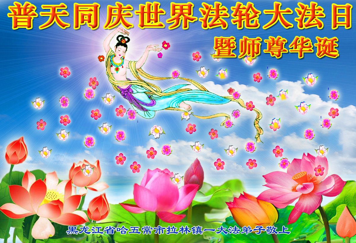 恭祝慈悲伟大师尊生日快乐! 黑龙江省哈尔滨市五常市拉林镇一大法弟子敬上 黑龙江省哈尔滨大法弟子恭祝世界法轮大法日暨师尊生日快乐!
