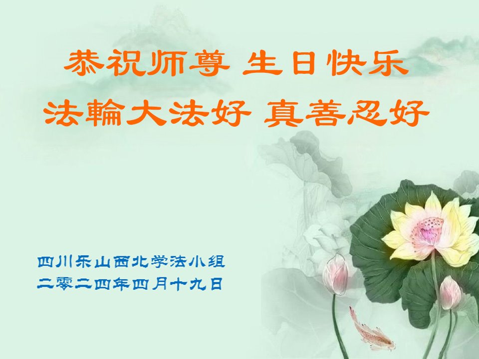 恭祝师尊生日快乐! 法轮大法好!真善忍好! 四川省乐山市全体大法弟子敬上 二零二四年四月十九日 四川省乐山市西北学法小组大法弟子恭祝师尊生日快乐!