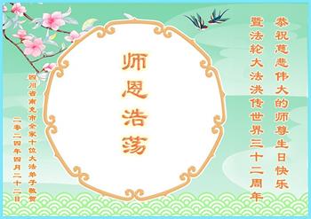 四川南充全家十位大法弟子恭祝慈悲伟大的师尊生日快乐暨大法洪传三十二周年!