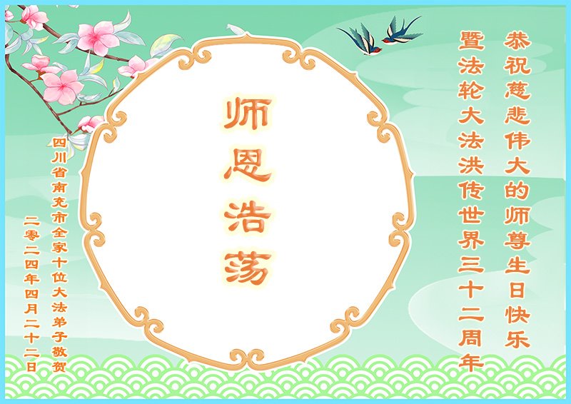 弟子感恩师尊传法普度!众生拜谢师尊慈悲救度! 四川南充顺庆区一大法弟子敬上 二零二四年四月二十二日 四川南充西城全体大法弟子恭祝慈悲伟大的师尊生日快乐!