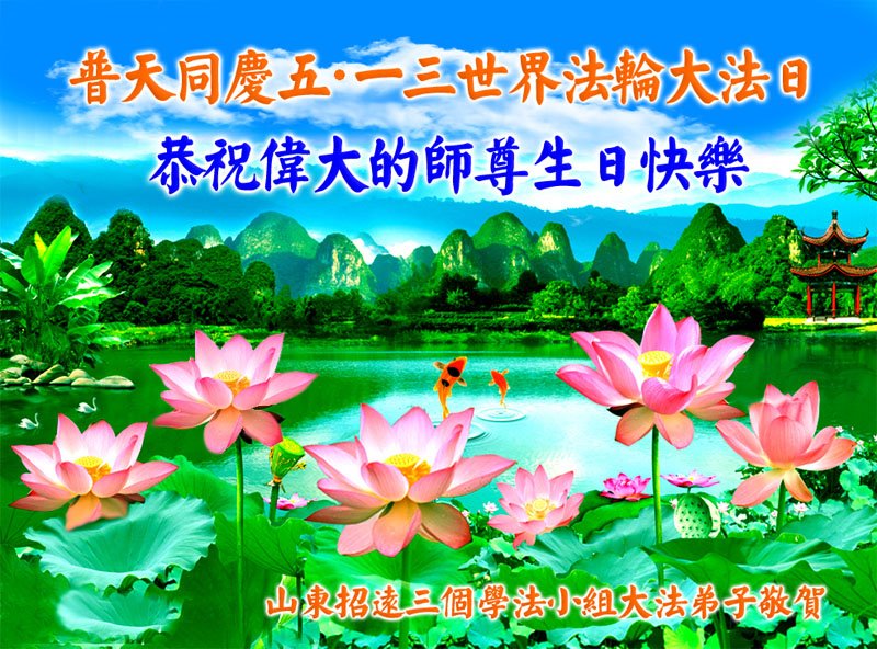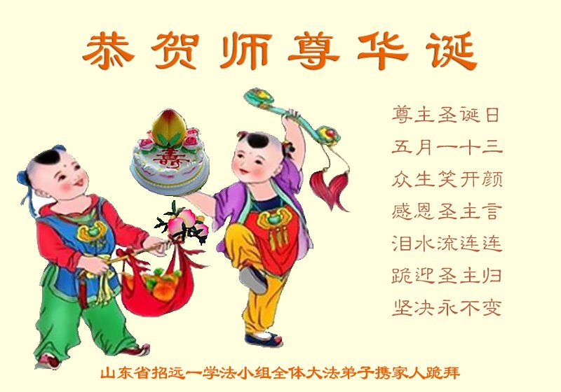 恭祝慈悲伟大的师尊生日快乐! 感恩师尊 慈悲救度 山东荣成石岛二位老年大法弟子共祝5·13世界法轮大法日! 恭祝慈悲伟大的师尊生日快乐! 感恩师尊 慈悲救度 山东省烟台市福山区一大法弟子和家人恭祝师尊生日快乐!
