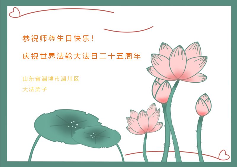 弟子恭祝师尊生日快乐!感恩师尊慈悲救度!感恩师尊把我们从地狱捞起洗净,走向返本归真路。弟子无以回报,只有听师尊的话,学好法,发好正念,遇事向内找,时时修心性,做一个合格的大法弟子,让师尊少一份操劳,多一份欣慰。 山东省淄博市淄川区大法弟子恭祝师尊生日快乐!庆祝第二十五届世界法轮大法日!