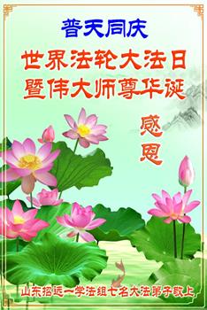 感谢师父传大法来救度众生,师父的大恩大德我们永远记在心中,相信师父、相信大法,不受任何谎言的欺骗和毒害,就听师父的话,跟着师父回到自己的家。 恭祝师父生日快乐!恭祝世界法轮大法日! 山东烟台招远城区学法组大法弟子恭祝世界法轮大法日暨师尊华诞!