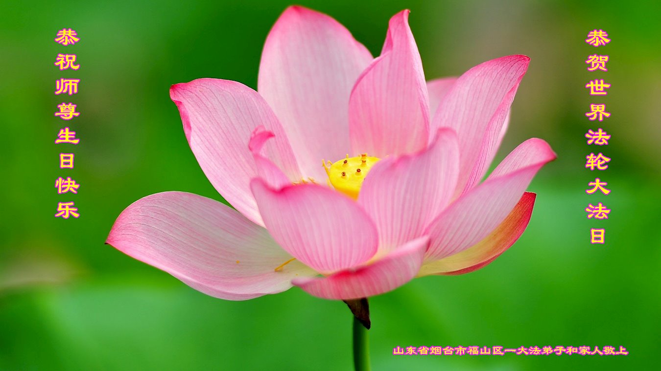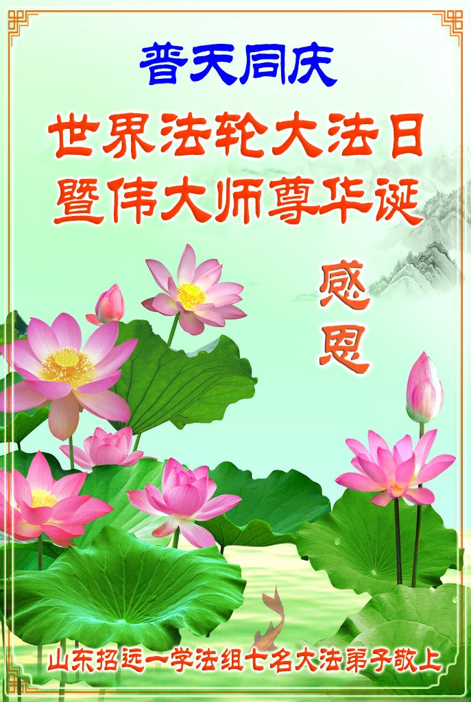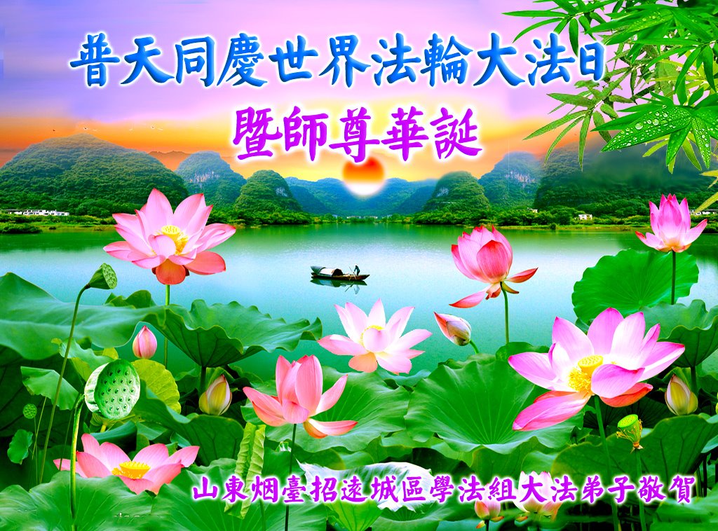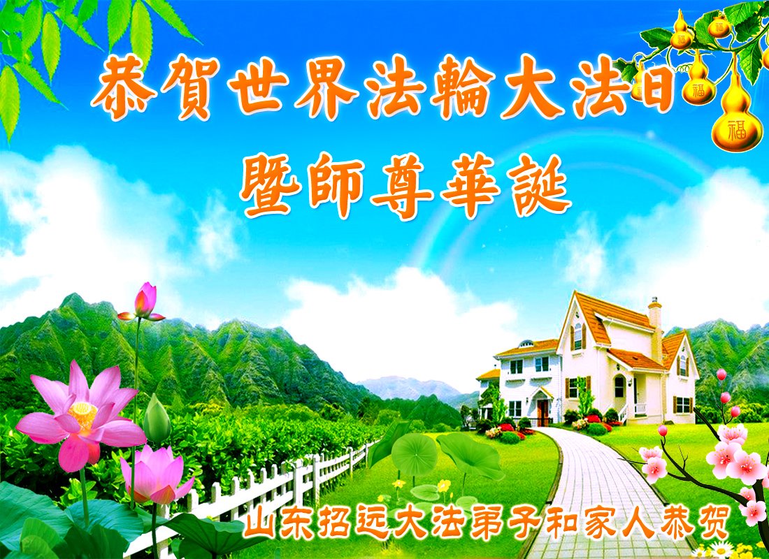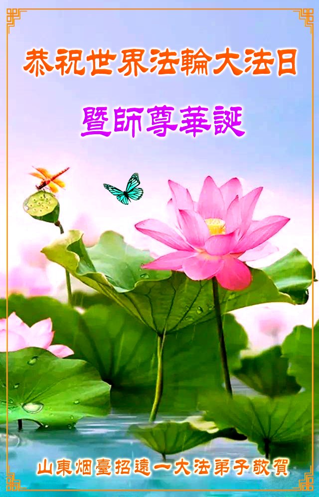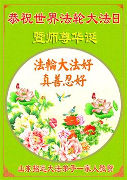 师父好!弟子全家八人都见证了法轮大法的力量,感到无比的幸福。值此世界法轮大法日,恭祝慈悲伟大的师父生日快乐! 山东省烟台市一家大法弟子敬上 山东省烟台市福山区全体大法弟子恭祝法轮大法日!