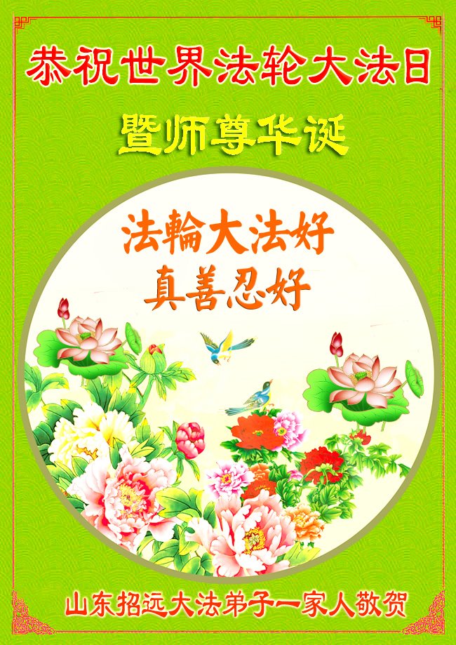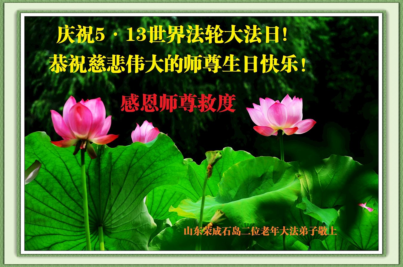 弟子恭祝师父生日快乐!恭贺世界法轮大法日! 我虽然没有文化,但我从心里知道法轮大法好。我一定听师父的话,多学法,多讲真相,多救人。弟子感恩师父的一路保护。 山东烟台招远一老年大法弟子敬上 山东荣成石岛二位老年大法弟子共祝5·13世界法轮大法日!