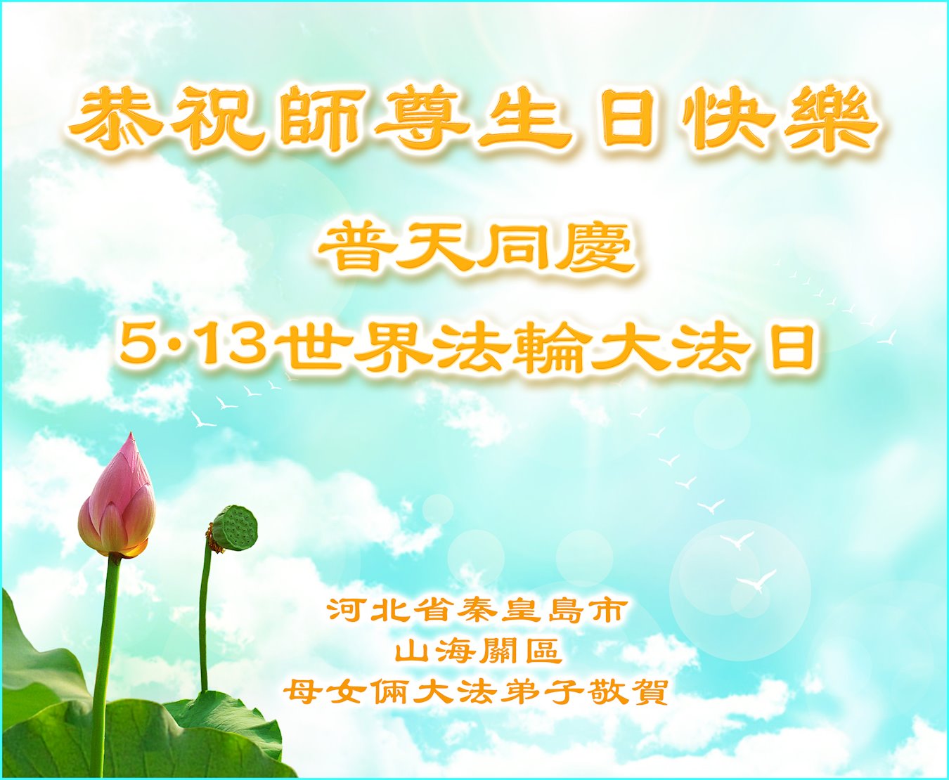 河北省秦皇岛市山海关区母女俩大法弟子恭祝慈悲伟大的师尊生日快乐!普天同庆世界法轮大法日!
