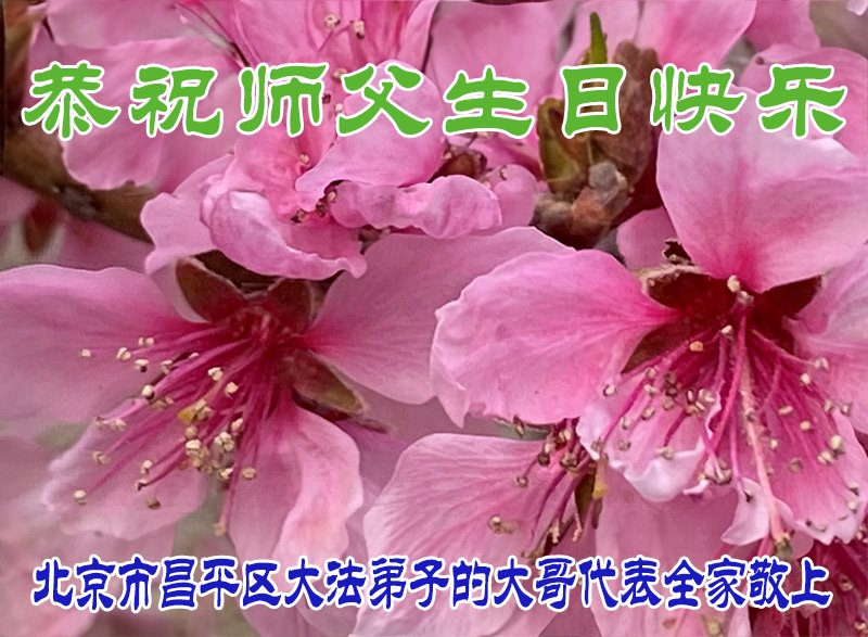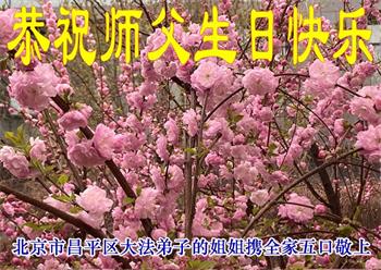 恭祝师父生日快乐! 恭祝慈悲伟大的师父生日快乐! 北京昌平一六人学法小组敬上 二零二四年五月三日 北京怀柔一大法弟子的儿子全家恭祝师父生日快乐!