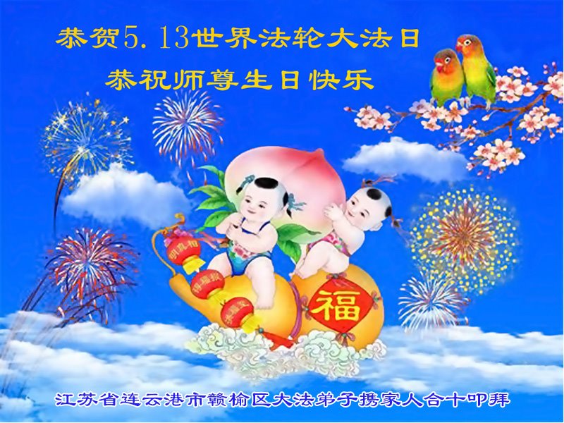 江苏省连云港市赣榆区大法弟子携家人恭贺5.13世界法轮大法日!恭祝师尊生日快乐!