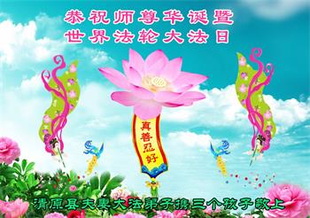 恭祝世界法轮大法日暨师尊华诞! 辽宁省清原县大苏河乡全体大法弟子及明真相家人敬上 辽宁省营口市大法弟子一家三口恭贺法轮大法日!