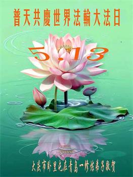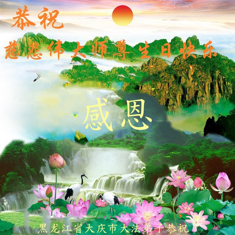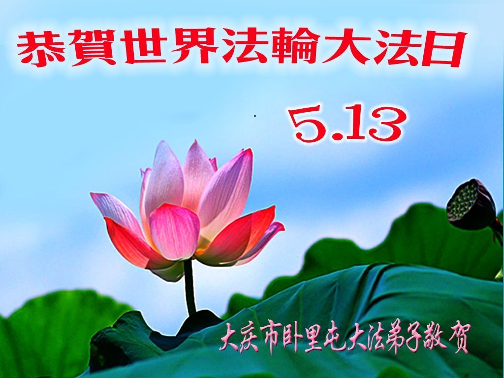 5∙13是世界法轮大法日,师尊慈悲苦度,洪恩无限,弟子只有真修向善,多救人,才可回报师恩,弟子恭祝慈悲伟大的师尊生日快乐! 黑龙江大庆市一学法小组大法弟子恭贺法轮大法日!恭祝师尊生日快乐!